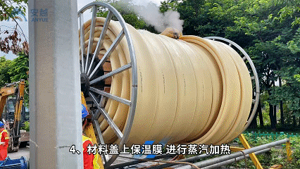 材料蓋上保溫膜進(jìn)行蒸汽加 將形狀為C型或者工字形管材拖入原管道